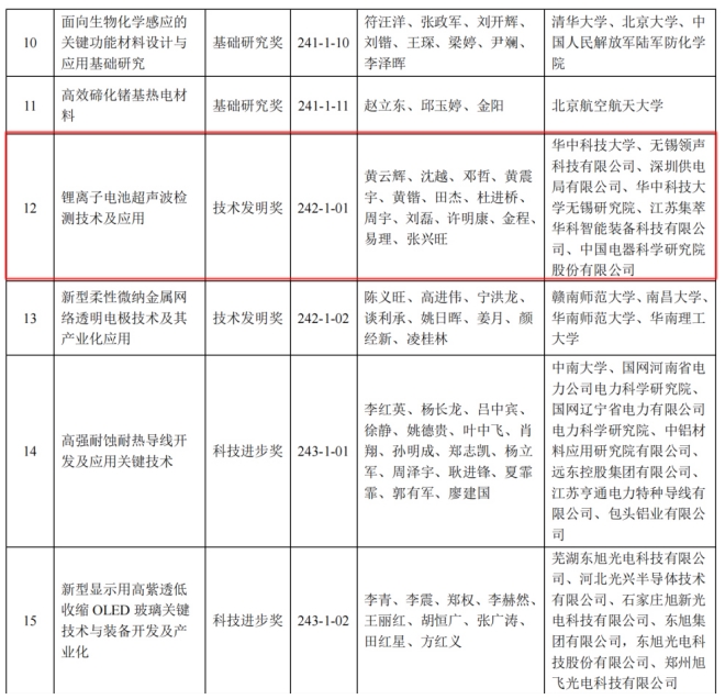 7月6日,中國材料研究學會科發布公告:按照《“中國材料研究學會科學技術獎”獎勵章程》規定,經嚴格評審,決定對 31 個項目授予 2024 年中國材料研究學會科學技術獎,由華中科技大學、無錫領聲科技有限公司、深圳供電局有限公司、華中科技大學無錫研究院、江蘇集萃華科智能裝備科技有限公司、中國電器科學研究院股份有限公司完成的“鋰離子電池超聲波檢測技術及應用”榮獲一等獎。