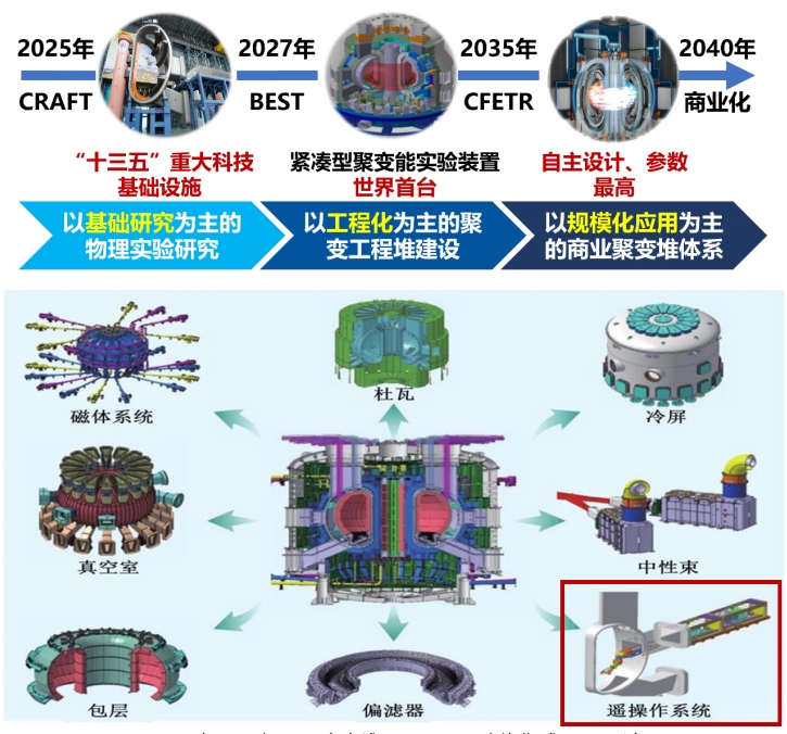 作為新質(zhì)生產(chǎn)力的重要一環(huán),可控核聚變是一種顛覆性的能源技術(shù),被視為人類能源的“終極答案”。作為我國(guó)核能發(fā)展戰(zhàn)略的“三部曲”(壓水堆-快堆-聚變堆)的最后一步,聚變堆的研發(fā)與建設(shè)對(duì)于推動(dòng)全球能源革命具有重大意義。目前,我國(guó)在核聚變領(lǐng)域的研究已走在世界前列,特別是在物理實(shí)驗(yàn)研究和聚變工程設(shè)計(jì)方面取得了顯著成就。為加速聚變工程的商業(yè)化進(jìn)程,在吸收消化設(shè)計(jì)基礎(chǔ)上,我國(guó)于2017年自主設(shè)計(jì)了中國(guó)聚變工程實(shí)驗(yàn)堆CFETR(Chinese Fusion Engineering Testing Reactor),開(kāi)展我國(guó)聚變工程實(shí)驗(yàn)堆的集成設(shè)計(jì)及其關(guān)鍵技術(shù)的研發(fā),旨在全面掌握下一代聚變堆的設(shè)計(jì)與建造技術(shù)。為保障CFETR在2035年前順利建成,合肥中科院等離子所于“十三五”期間牽頭研發(fā)了聚變堆主機(jī)關(guān)鍵系統(tǒng)綜合研究設(shè)施(CRAFT),旨在構(gòu)建國(guó)際核聚變領(lǐng)域參數(shù)最高、功能最完備的綜合性研究及測(cè)試平臺(tái),用于支持超導(dǎo)磁體、聚變堆真空室、遙操作系統(tǒng)等核心技術(shù)攻關(guān)和關(guān)鍵設(shè)備研發(fā)。