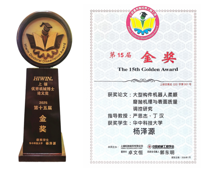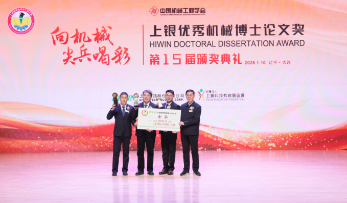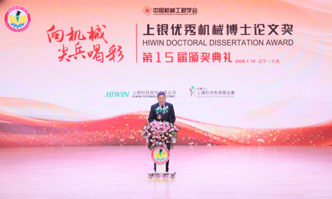 2026 年1月10 日,第15屆“上銀優秀機械博士論文獎”頒獎典禮暨2026年機械工程青年菁英論壇在遼寧大連隆重召開。由丁漢院士、嚴思杰教授指導,我院與華中科技大學聯合培養的楊澤源博士斬獲金獎,實現了華中科技大學在該獎項金獎上“零”的歷史性突破。該獎項由上銀科技股份有限公司(HIWIN)于2011年設立,并由中國機械工程學會組織評選,是國內機械工程領域博士論文的最高榮譽。